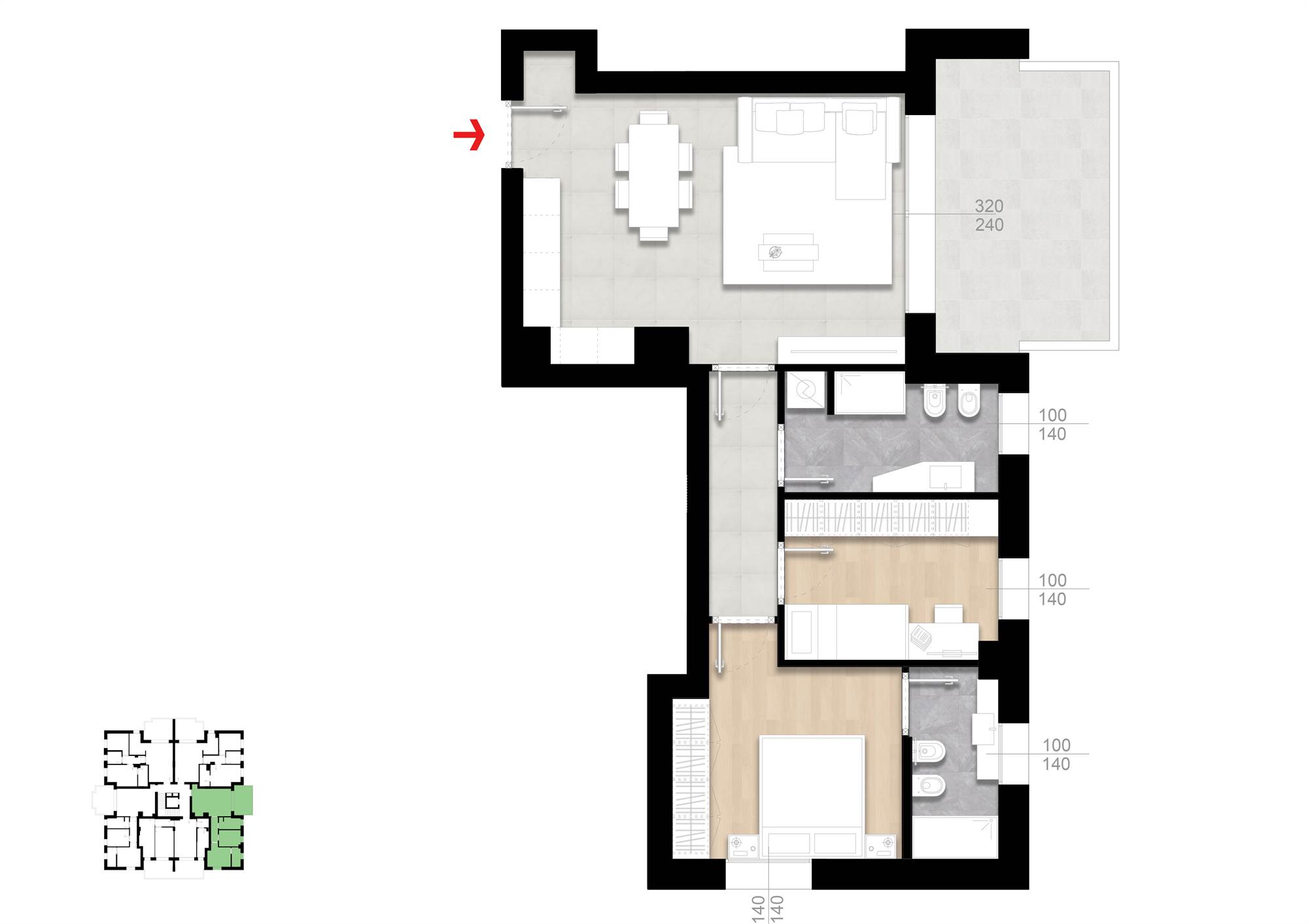 Tutte le soluzioni godono di un grande terrazzo o di ampio giardino privato. PROPOSTA: Trilocale 9D Luminoso trilocale di 92 mq composto da: ingresso, soggiorno con ampie vetrate sul terrazzo loggiato di oltre 13 mq, angolo cottura, due camere da letto e doppi servizi, di cui uno privato incamera.