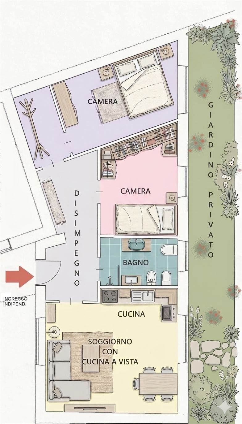 trilocale di mq. 84 , posto al piano terra con ingresso indipendente e annesso giardino privato di mq. 40.