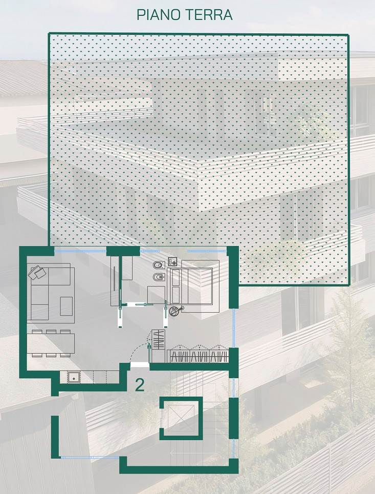 Bilocale di 59 mq, composto da: ingresso, soggiorno con ampie vetrate sul patio esterno, cucina, camera da letto e servizio.
