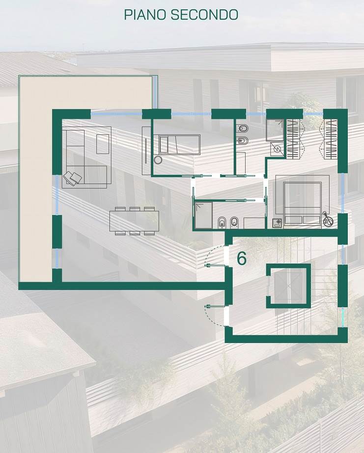 Piani Superiori: unità funzionali valorizzate da terrazzi loggiati di generose dimensioni, concepiti come estensione naturale della zona giorno.
